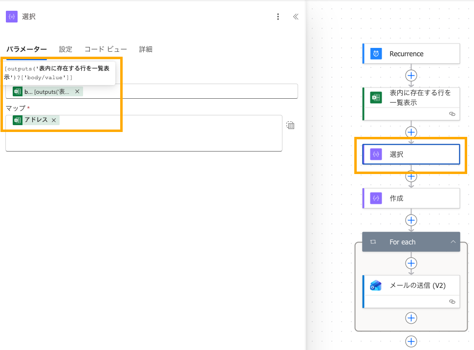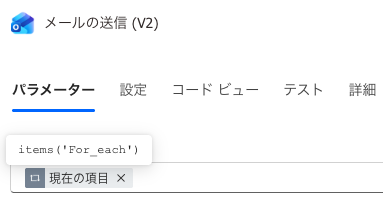 - 「For each」で繰り返しに使用し、「メールの送信(V2)」アクションの宛先に指定する。