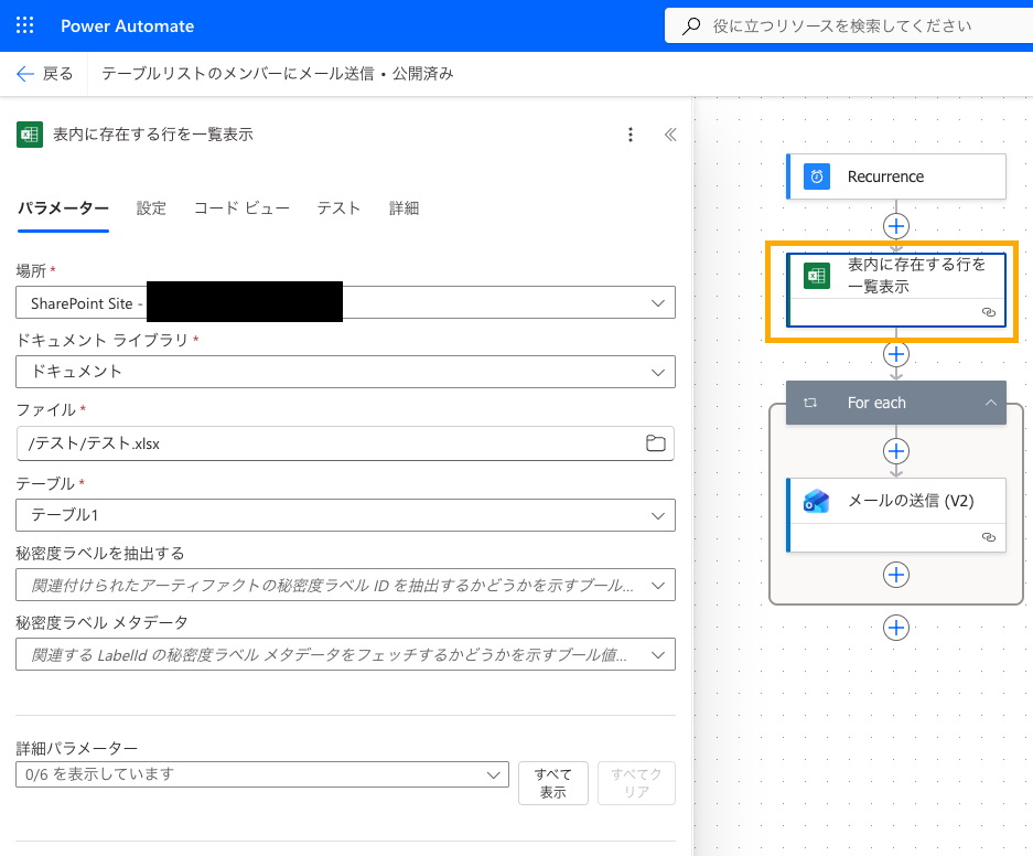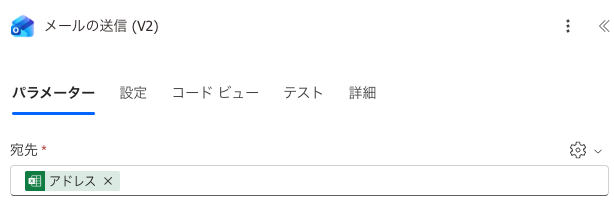 - 「For each」のアドレスを「メールの送信(V2)」アクションの宛先に指定してメールを送信する。