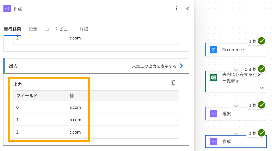 実際に動作させると、下図のように、「作成」アクションでExcelデータの5行目(a.com)が消えています。